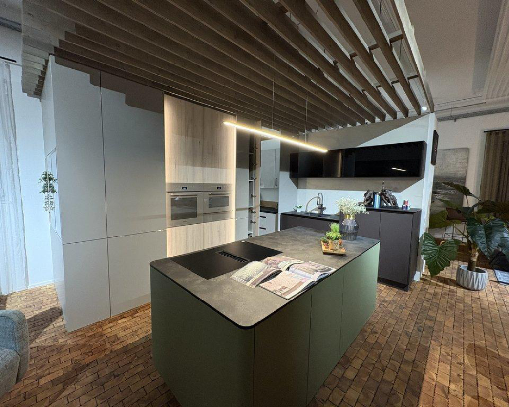 Ein prägendes Gestaltungselement unserer Schauraumküche ist die Deckenlösung mit Holzlamellen. Sie strukturiert den Küchenbereich, ohne ihn räumlich abzutrennen, und schafft eine klare architektonische Ordnung. Gleichzeitig ermöglicht sie eine gezielte Lichtführung über der Kücheninsel und den Arbeitsflächen. Das Ergebnis ist eine Küche, die optisch ruhig wirkt und im Alltag Komfort bietet.